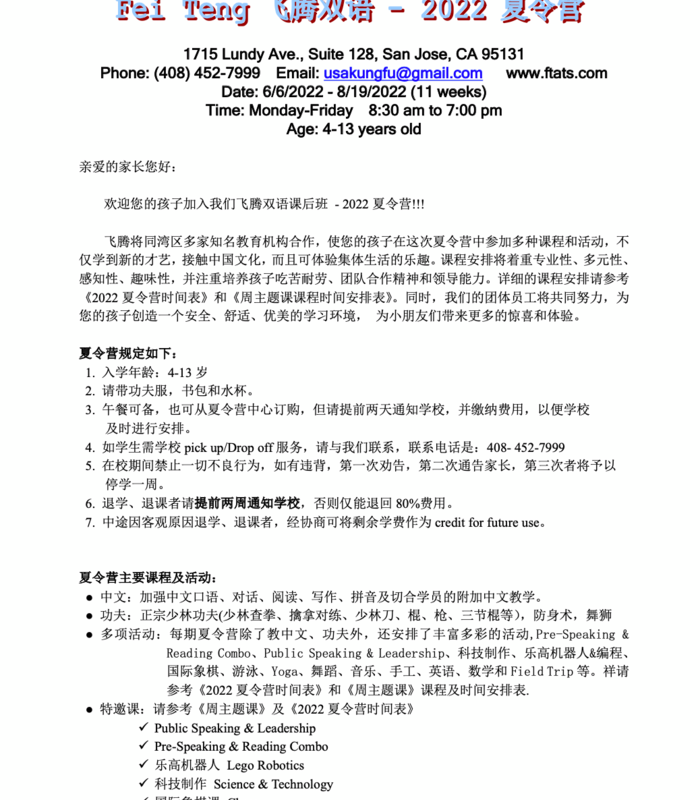 2022 年夏令营时间表 Summer Camp Daily Schedule